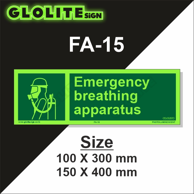 The Emergency Breathing Apparatus FA-15 signage plays a crucial role in safety preparedness by clearly marking the location of life-saving respiratory equipment in facilities that deal with smoke, toxic gases, or oxygen-deficient environments. Designed using high-performance photoluminescent materials, the sign remains visible even in complete darkness or during power failures—ensuring that personnel can quickly locate breathing apparatuses in emergency situations such as fire, gas leaks, or confined space rescues.